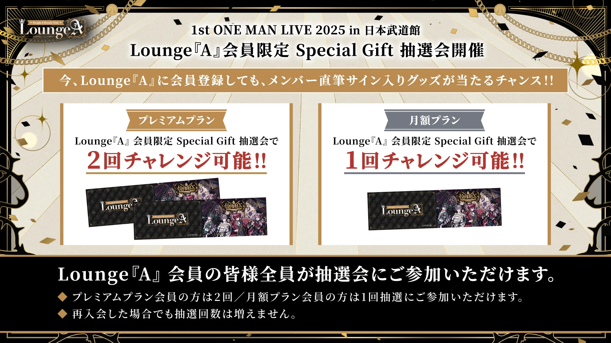 騎士X - Knight X - 1st ONE MAN LIVE 2025 in 日本武道館の開催を記念し、Lounge『A』会員の皆様にお楽しみいただけるキャンペーンの開催が決定いたしました。