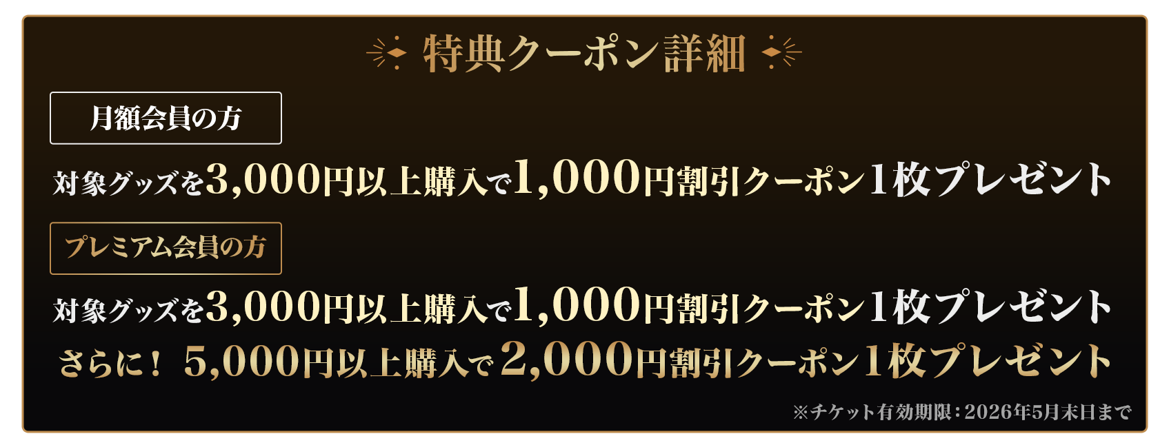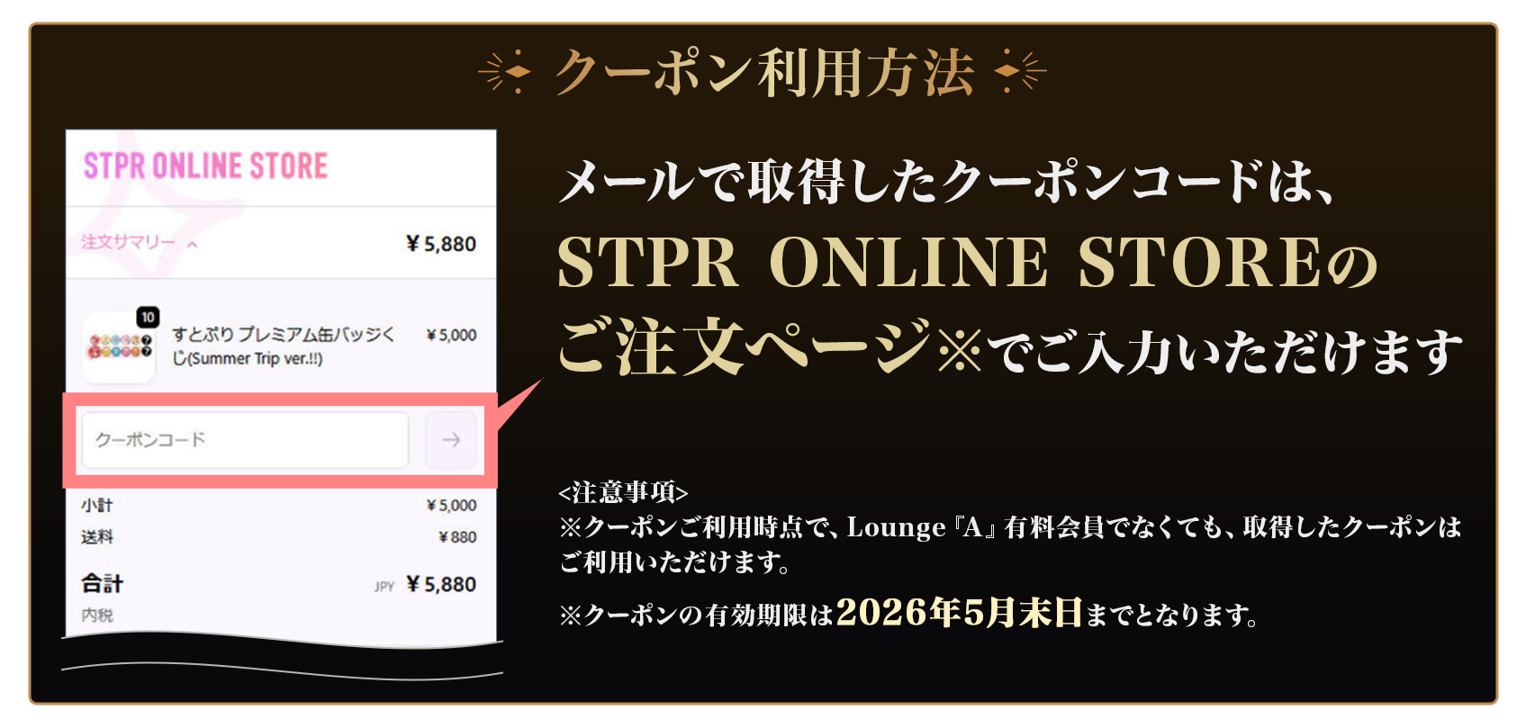 「新しいLounge『A』」に早期入会いただいた皆様へ、早期入会特典として「STPR ONLINE STORE」の対象商品にご利用いただける【特別クーポン】を発行いたしました。